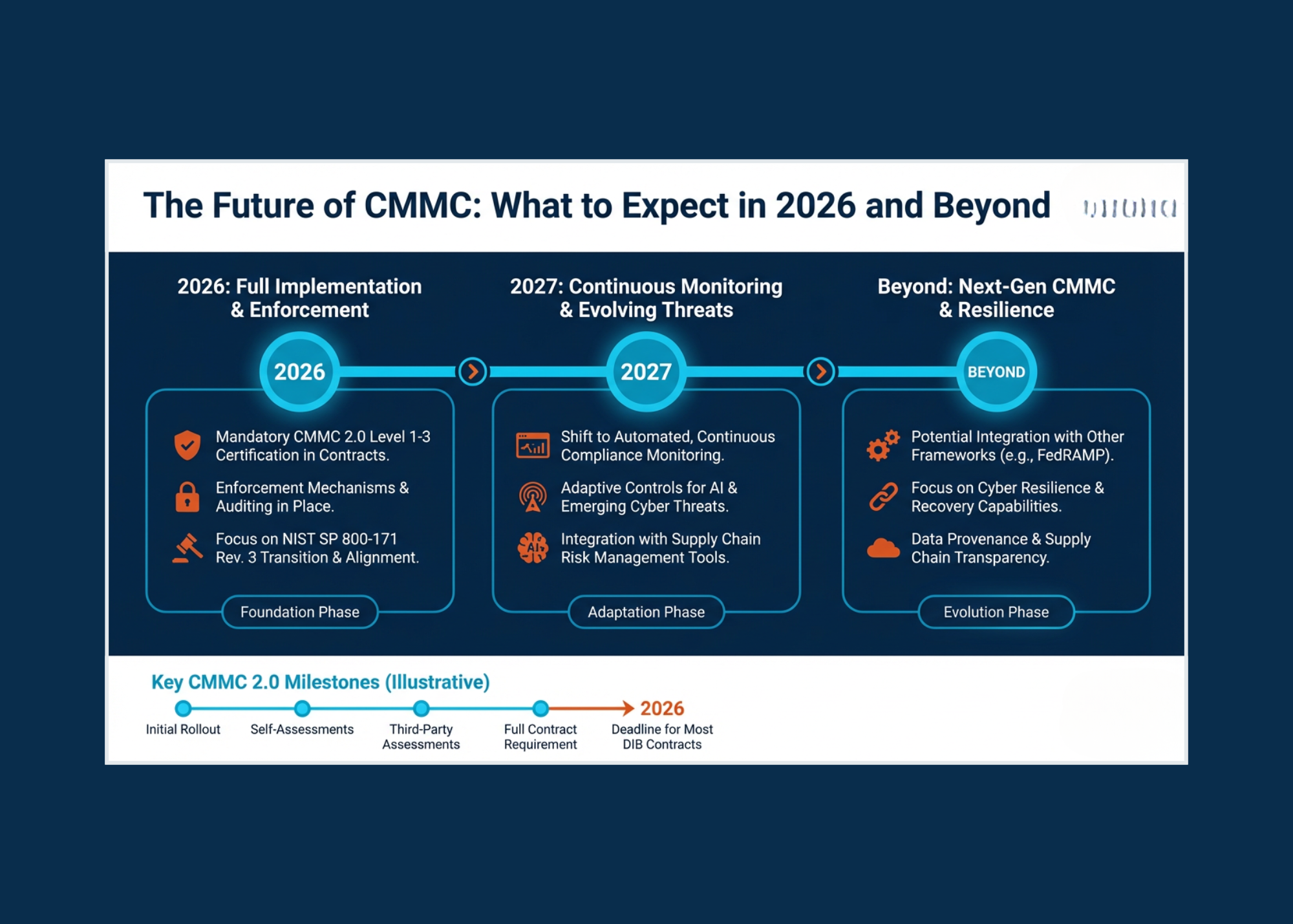 CMMC will continue to evolve as the DoD strengthens national security and accountability among its contractors. Organizations that invest early in sustainable cybersecurity practices (and not one-off checklists) will be best prepared for the future.